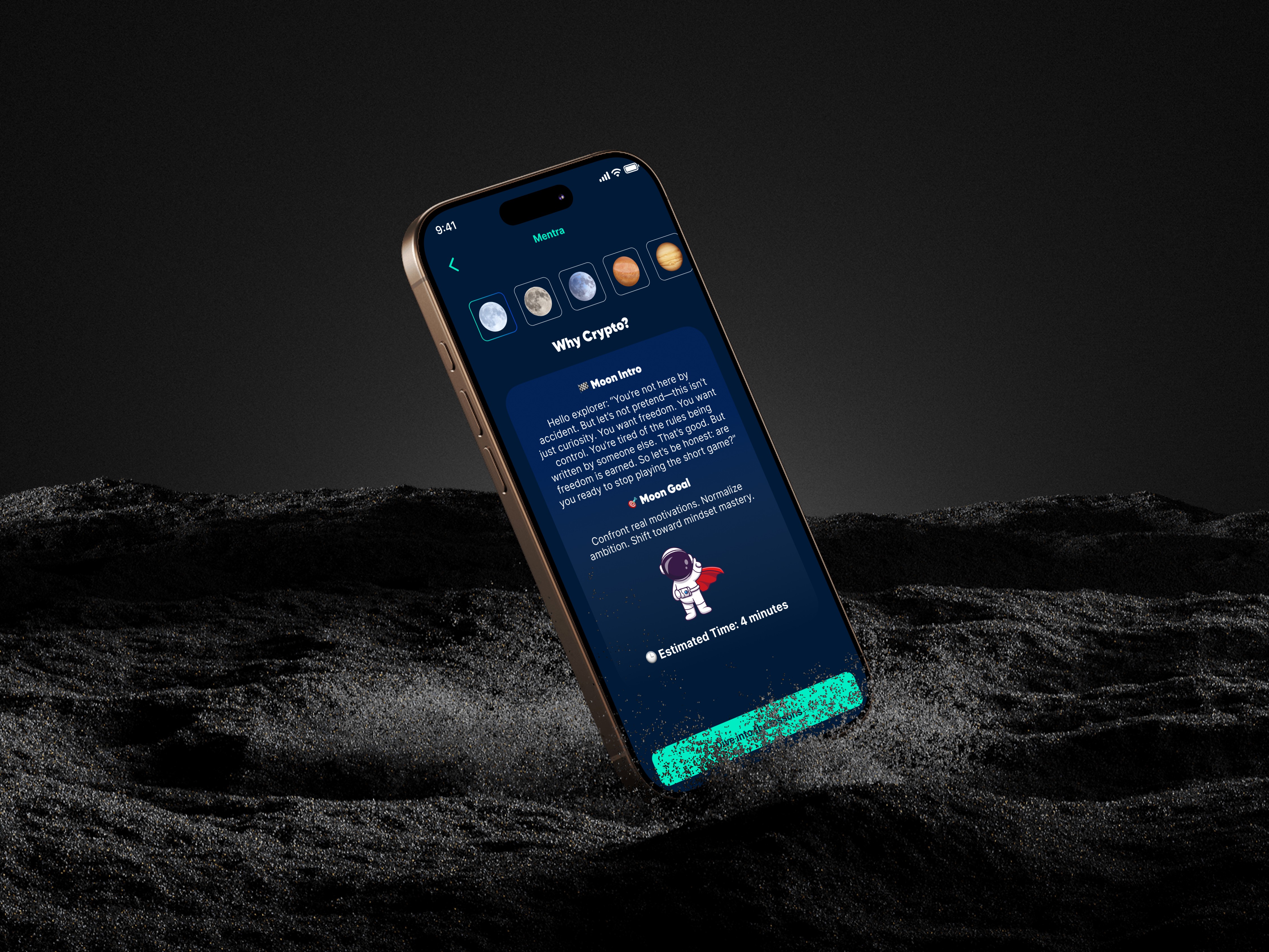 Information Architecture: I architected the knowledge into a series of "Planets" (modules like Mentra: Mindset & Financial Freedom) and "Moons" (bite-sized lessons). This cosmic hierarchy transformed the complex task of learning into a clear, attainable journey.