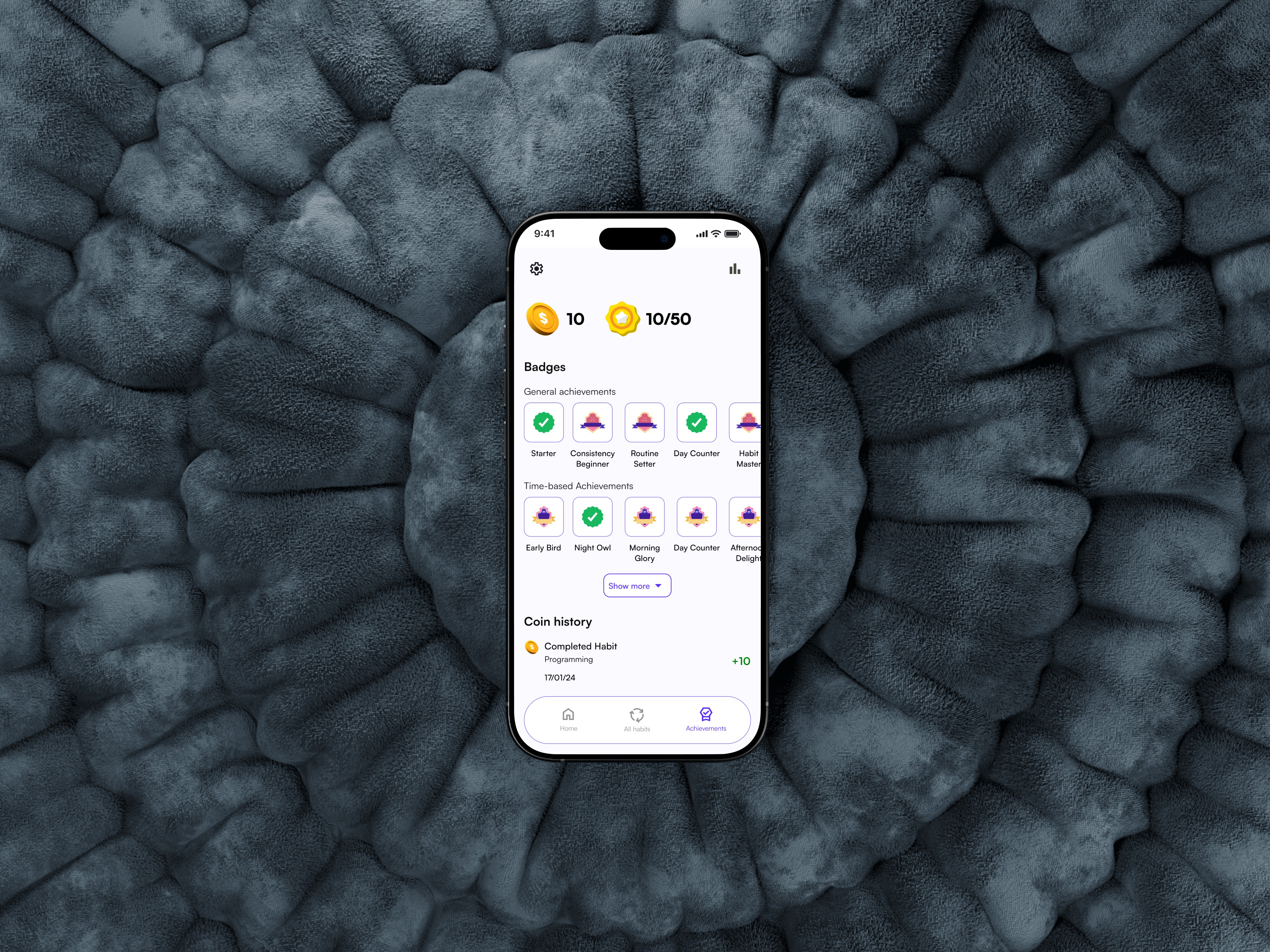 Gamified Rewards (The Coin Economy): I designed a system where completing tasks earns Coins (e.g., +10 to +100 for milestones) and unlocks Badges (e.g., "Starter," "Routine Setter") for achieving consistency and mastery. This visual feedback loop transforms tracking into a tangible progression system.